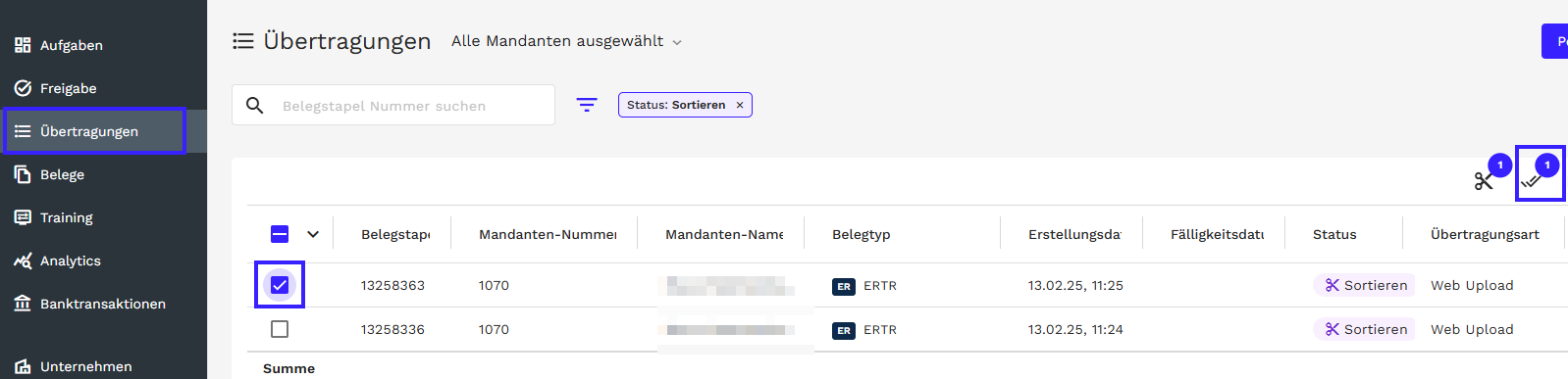 Wählen Sie die zu exportierenden Belege aus und bestätigen Sie die Sortierung der Belege durch Klick auf die Doppelhaken.