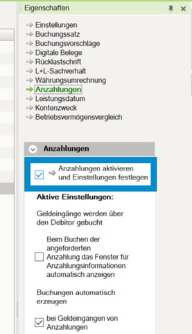 Öffnen Sie zunächst die Buchführung und klicken Sie anschließend auf Belege buchen - Eigenschaften. Aktivieren Sie nun die Checkbox “Anzahlungen aktivieren und Einstellungen festlegen”. Klicken Sie im Anschluss auf den Text neben der Checkbox um die Einstellungen zu den Anzahlungsrechnungen zu öffnen und gehen Sie diese Schritt für Schritt durch.