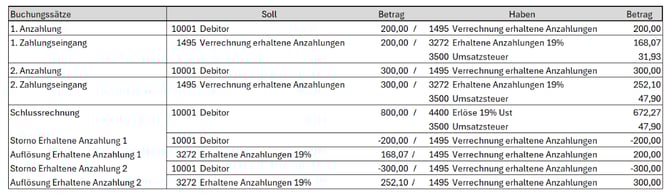 Sobald die passende Schlussrechnung eingeht, löst die DATEV anhand der Zuordnung der Auftragsnummer alle Anzahlungsbuchungen entsprechend auf und führt die richtigen Umbuchungen durch.
