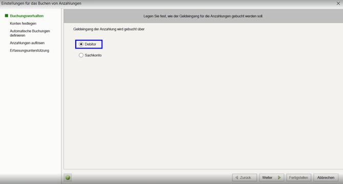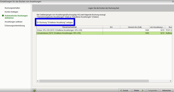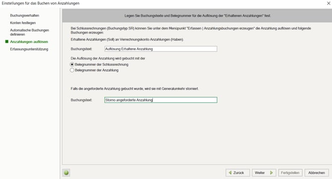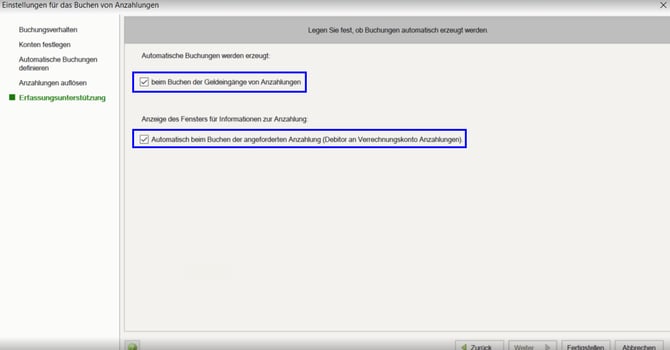 Legen Sie fest, ob die Umbuchungen der erhaltenen Anzahlungen automatisch bei Geldeingang erfolgen sollen oder ob diese manuell ausgelöst werden müssen.