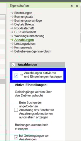 Öffnen Sie die Buchführung und navigieren Sie zu Belege buchen > Eigenschaften. Aktivieren Sie die Checkbox "Anzahlungen aktivieren und Einstellungen festlegen". Klicken Sie auf den Link daneben, um das Konfigurationsmenü zu öffnen.