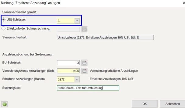 - DATEV: Anhand der identischen Auftragsnummer erkennt DATEV die Zusammengehörigkeit. Geht eine Zahlung mit dieser Auftragsnummer ein, wird die Anzahlung automatisch verbucht.