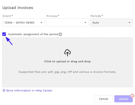 When uploading documents in the web version of Finmatics, you can choose between two options. You can either set the period manually or have it predicted automatically using the "Automatic assignment of the period" checkbox.