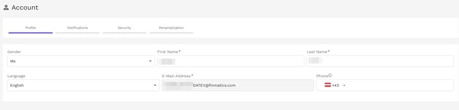 You can change your name, salutation and telephone number and set the language in which Finmatics should be displayed. Do not forget to click on "Save" before you leave the page to confirm the changes.