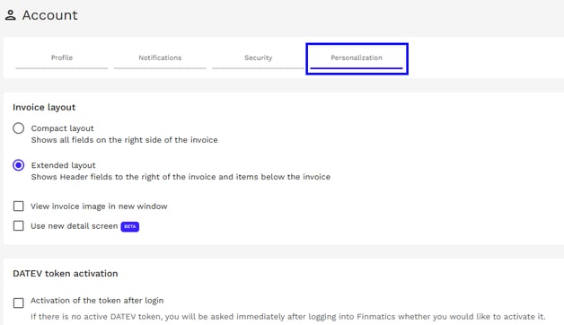 In the "Personalization" tab, you have various options for setting the invoice detail screen. You can customise the display of invoice fields in the invoice detail screen. DATEV users can also specify whether the token should be activated after logging into the web interface.