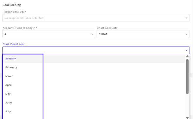 To define a non-standard fiscal year, open the drop-down menu in the "Start of Fiscal Year" field and select the corresponding month.