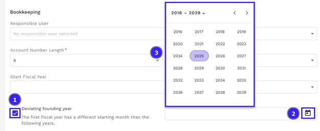 If you wish to set an individual foundation year, check the "Deviating founding year" box and use the calendar symbol to set the desired month.