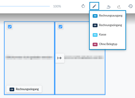 Um den Belegtypen für mehrere Belegseiten gleichzeitig anzupassen, markieren Sie die gewünschten Seiten und klicken Sie im Anschluss auf das Stiftsymbol, um den korrekten Belegtyp auszuwählen.