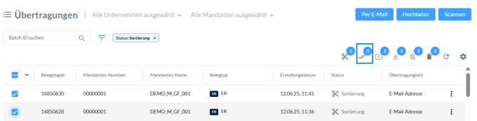 Alternativ können Sie auch über die Übertragungen-Ansicht Belege neu sortieren und bearbeiten. Lesen Sie hierzu Wie nutze ich die Übertragungen-Ansicht?.