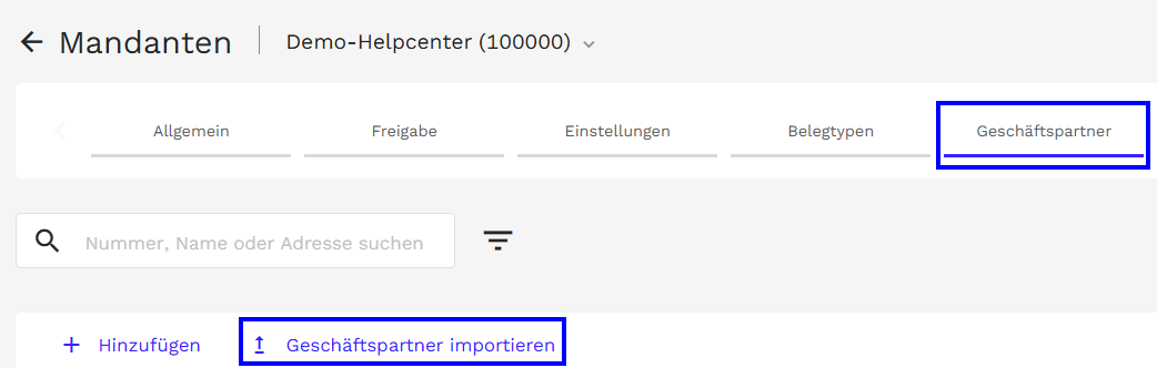 - Klicken Sie in der Mandanten-Ansicht auf den Reiter Geschäftspartner.