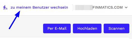 Nach dem Klick sehen Sie das Finmatics-Portal exakt so, wie es der ausgewählte Benutzer sieht. Sie erkennen den aktiven Imitations-Modus an dem Strichmännchen-Symbol oben rechts neben dem Namen des imitierten Benutzers. In diesem Modus können Sie alle Aktionen durchführen, die auch der imitierte Benutzer ausführen dürfte.