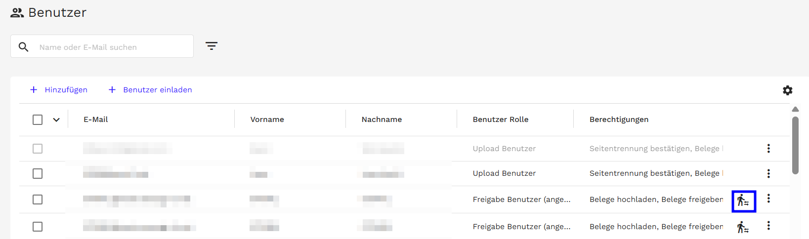 - Klicken Sie in der Tabellenzeile des Benutzers auf das Symbol mit dem Strichmännchen (Impersonation).