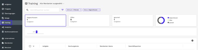 Das Trainingscenter hilft, die Automatisierungsquote der buchhalterischen Felder zu steigern, indem Aufgaben erstellt werden, durch welche die Software trainiert wird. Finmatics lernt in der Regel durch jede Korrektur, die Sie an Belegen vornehmen.