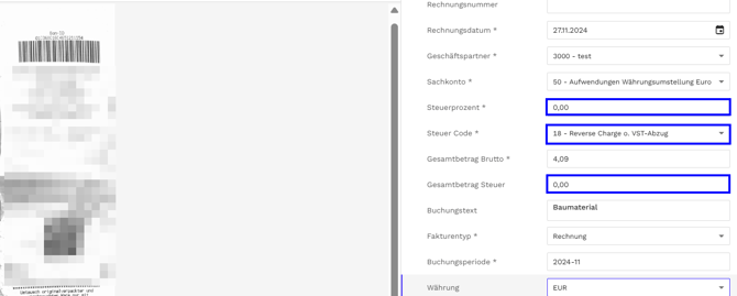 Da die BMD-Software die Steuerberechnung für Reverse Charge Fälle automatisch beim Import des Belegs durchführt, müssen die Steuerwerte in Finmatics neutralisiert werden. Dies verhindert, dass beim Export der Belege in die BMD eine doppelte Steuerberechnung oder Differenzen entstehen.