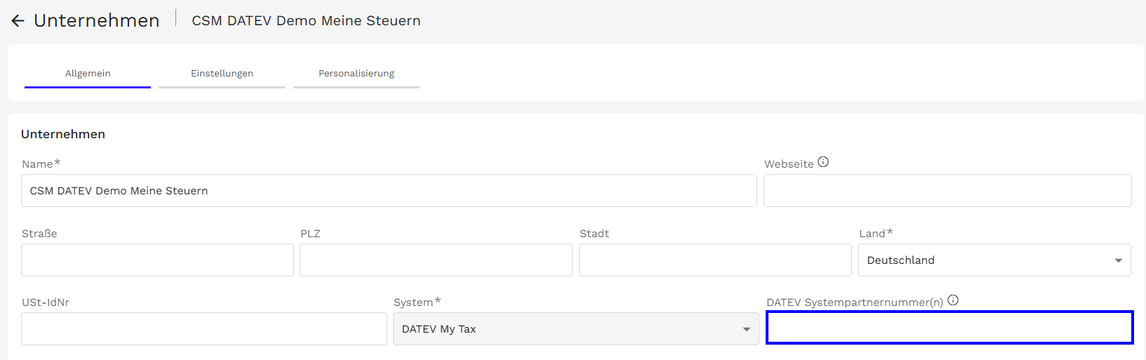 Sie können die DATEV-Beraternummer direkt in den Stammdaten Ihres Unternehmens hinterlegen. Navigieren Sie dazu im linken Menü zu Unternehmen, wählen Sie das entsprechende Unternehmen aus und tragen Sie die Nummer im Reiter Allgemein in das Feld "DATEV Systempartnernummer(n)" ein.