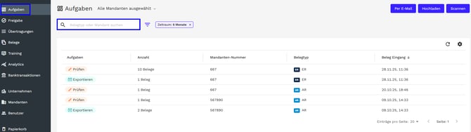 Der Menüpunkt Aufgaben dient als Ihre Startseite. Hier finden Sie alle Belege gebündelt, die eine buchhalterische Kontrolle oder Bearbeitung erfordern. Nutzen Sie die Suchfunktion, um gezielt nach Mandantennamen oder Belegtypen zu filtern.