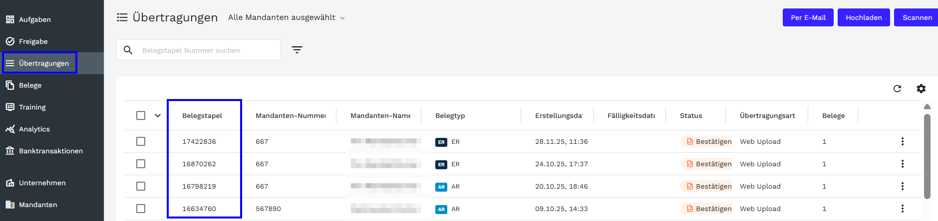 Tipp: Blenden Sie in der Tabellenansicht die Spalte 'Belegstapel' ein. Die dortige ID hilft unserem Support-Team bei spezifischen Anfragen zu Übertragungen.