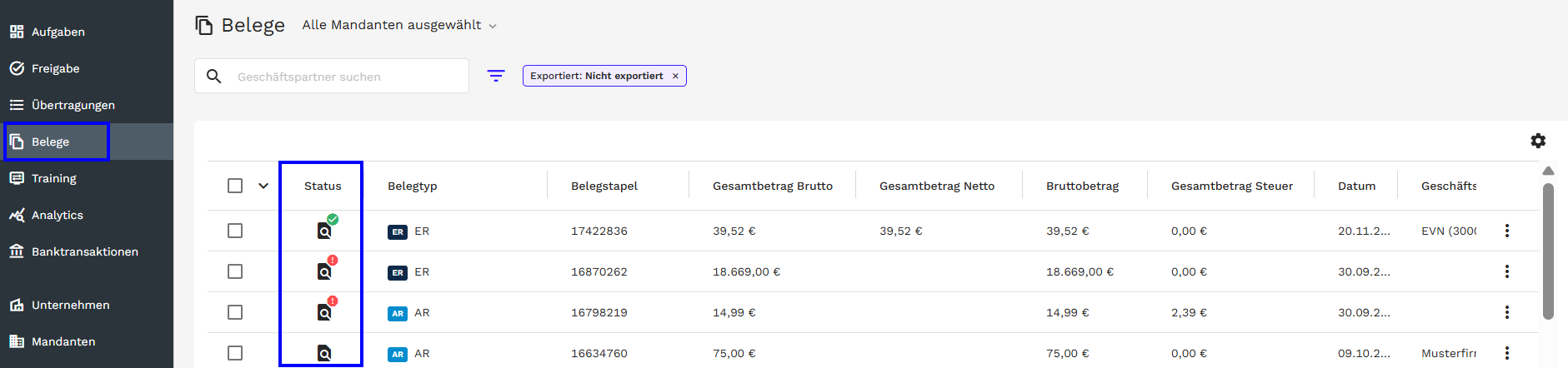 Standardmäßig können gelb und grün markierte Belege exportiert werden. Rot markierte Belege müssen vor dem Exportieren nachbearbeitet werden.
