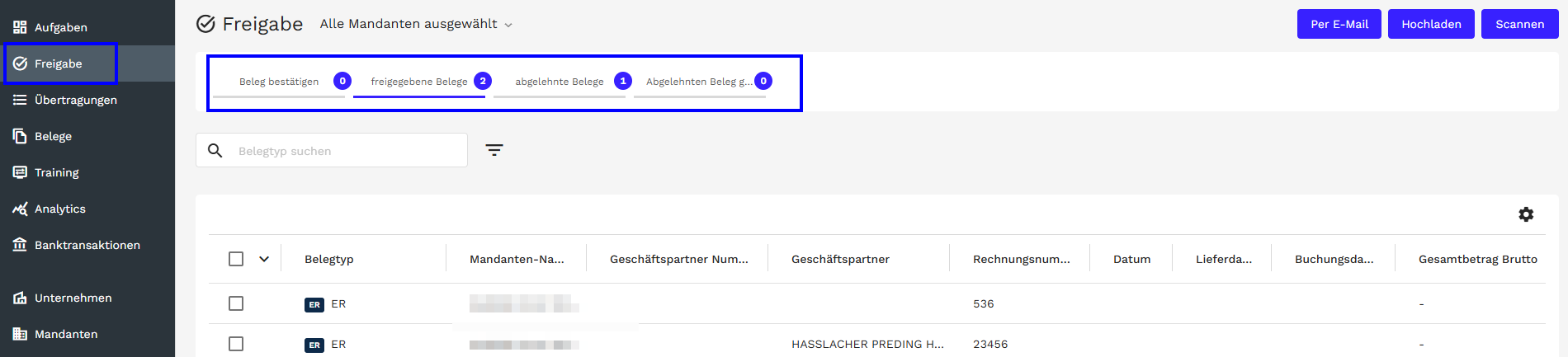 Im Bereich Freigabe sehen Sie alle Belege, die Teil eines konfigurierten Workflows sind. Bevor diese exportiert werden können, müssen sie hier genehmigt oder abgelehnt werden. Sollten Sie einen mehrstufigen Workflow nutzen, wird der aktuelle Status hier visualisiert.