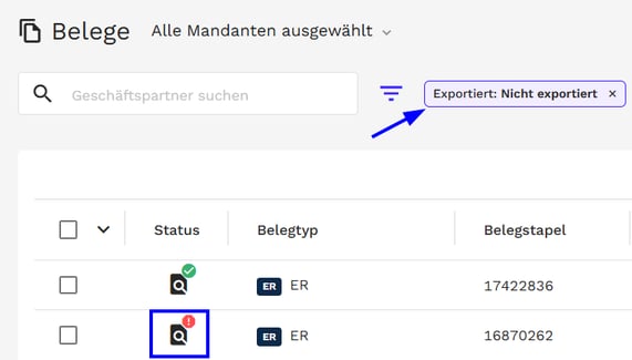 - Warnungen in Finmatics: Prüfen Sie in der Finmatics Web-Oberfläche (Ansicht "Belege" mit Filter "nicht exportiert"), ob Warnungen vorliegen.