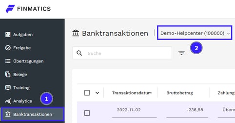Öffnen Sie den Reiter “Banktransaktionen” im Hauptmenü. Über die Übertragungen-Ansicht gelangen Sie durch Klick auf den Kontoauszug bzw. Kontoauszug-Stapel ebenfalls in den Reiter “Banktransaktionen”. Wählen Sie nun über das Drop-Down Menü den Mandanten aus, für welchen Sie Banktransaktionen anzeigen lassen wollen.