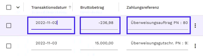 Im Reiter “Banktransaktionen” besteht die Möglichkeit die ausgelesenen Daten zu überprüfen und zu ergänzen. Klicken Sie dafür in das jeweilige Feld und ändern Sie den Eintrag.
