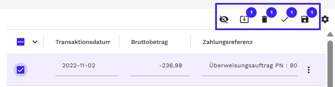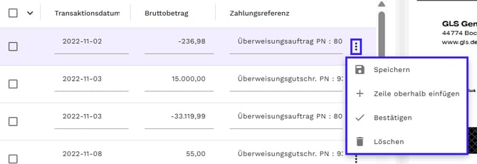 Über das Drei-Punkte Menü können Sie vorgenommene Änderungen speichern, Transaktionen bestätigen sowie diese löschen. Bei Bedarf kann außerdem eine neue Zeile eingefügt werden, um weitere Transaktionen zu erfassen.
