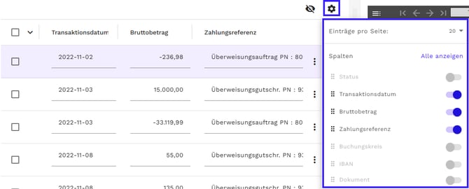 Zusätzlich zu den drei standardgemäß eingeblendeten Spalten haben Sie die Möglichkeit, eine Reihe von weiteren Spalten anzeigen zu lassen. Wählen Sie hierfür das Zahnrad, um das Menü zur Auswahl einzublenden.