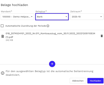 Bei Hochladen der Kontoauszüge in Finmatics, wählen Sie bei Belegtyp "Bank" aus. Zu den Dateitypen, die verarbeitet werden können, gehören gescannte Kontoauszüge und Kontoauszüge im PDF-Format.