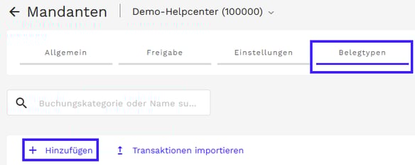 Wählen Sie in der Mandanten-Ansicht den gewünschten Mandanten aus und öffnen Sie den Reiter „Belegtypen“. Klicken Sie anschließend auf „Hinzufügen“.