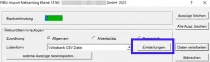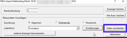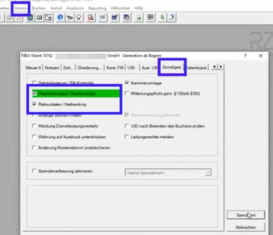 Kontrollieren Sie ob das Netbanking aktiviert ist. Aktivieren Sie es bei Bedarf in der FIBU über Stamm - Klient - Sonstiges und wählen Sie „Überweisungen/Bankeinzüge“ und „Retourdaten/Netbanking“ aus. Speichern Sie die Einstellungen anschließend.