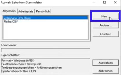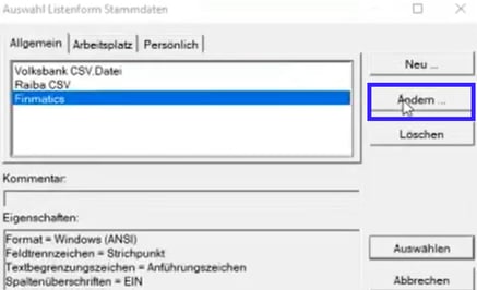 Im Reiter Optionen wählen Sie unter Feldtrennzeichen "Komma" aus. Klicken Sie nun auf "Ändern". Wählen Sie jetzt die neu angelegte Liste aus und klicken Sie auf "Auswählen". Klicken Sie auf "externe Auszüge hereinspielen"  und "Durchsuchen".