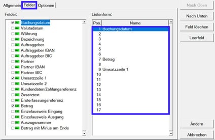 Legen Sie im Reiter Felder einmalig für alle Klienten die Felder in der unten angegebenen Reihenfolge an. Wählen Sie hierzu die Felder aus der linken Tabelle aus und fügen Sie über die Schaltfläche „Leerfeld“ auf der rechten Seite Leerfelder hinzu.