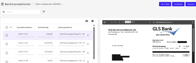 Auf der linken Seite der Ansicht sehen Sie die standardgemäß eingeblendeten Felder “Transaktionsdatum”, “Bruttobetrag” und “Zahlungsreferenz”. Dies sind diejenigen Felder, welche von Finmatics ausgelesen werden. Auf der rechten Seite sehen Sie das Bild des Kontoauszugs.