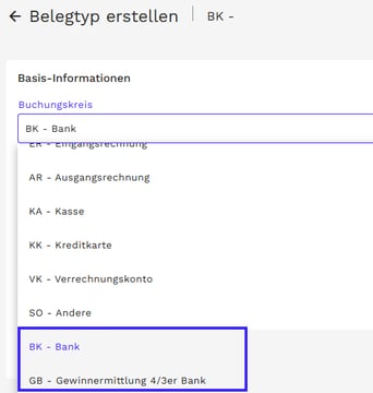 Wählen Sie nun in den Basis-Informationen den Buchungskreis “Bank” oder “Gewinnermittlung 4/3er Bank” aus.