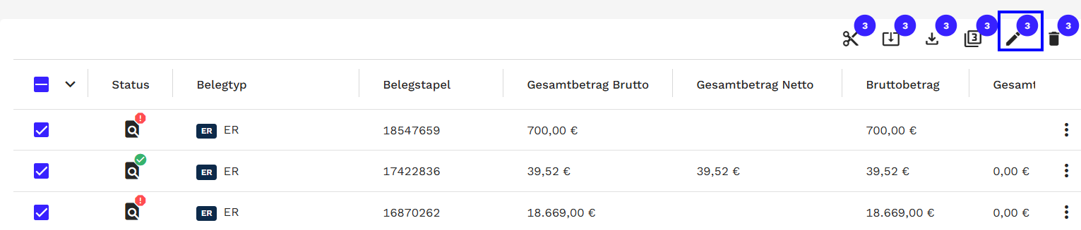 - Klicken Sie oben rechts in der Aktionsleiste auf das Stift-Symbol ("Belege bearbeiten").