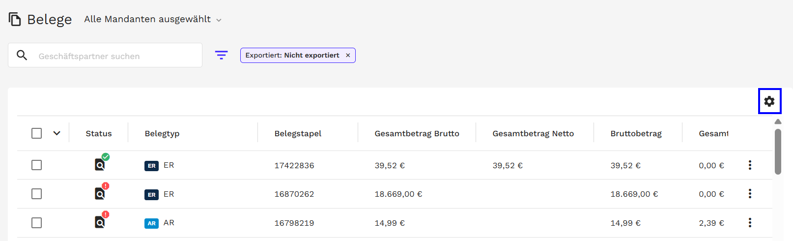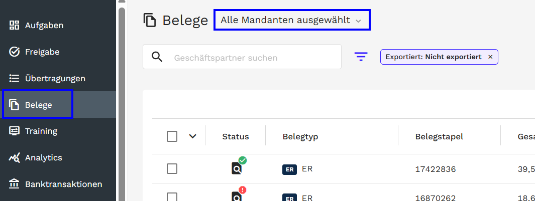 Hinweis: Die folgende Anleitung bezieht sich beispielhaft auf die Belege-Ansicht, die Vorgehensweise ist jedoch in den Ansichten für Aufgaben, Übertragungen, Freigaben und Mandanten nahezu identisch.