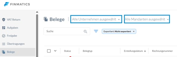 Im linken oberen Bereich der Ansicht befindet sich das Auswahlfeld für Mandanten oder Unternehmen.
