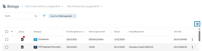 Sie können die Tabellenansicht individuell konfigurieren, um genau die Informationen zu sehen, die für Ihre Arbeit relevant sind. Klicken Sie dazu auf das Zahnrad-Symbol rechts oben über der Tabelle.
