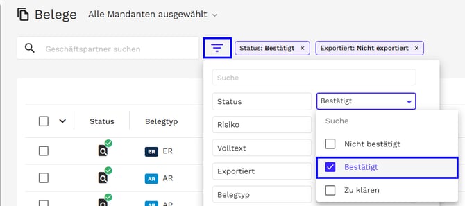 Nutzen Sie die Filterfunktion, um sich gezielt nur die verifizierten Belege anzeigen zu lassen. Wählen Sie dazu im Filtermenü den Status Bestätigt aus.