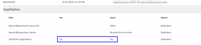 Hinweis: Sollte ein Beleg mehrfach bearbeitet worden sein, erscheint das Ereignis 'Bearbeitet' mehrmals. Suchen Sie nach dem Eintrag Verifizierungsstatus. Die Zahl 20 signalisiert, dass der Beleg vom Status 'Bestätigt' (10) in den Status 'Verifiziert' (20) übergegangen ist.