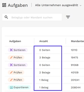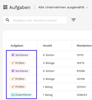 In der Aufgaben-Ansicht finden Sie alle Belege, die noch bearbeitet werden müssen, bevor sie für den Export in das Buchhaltungssystem bereitstehen.