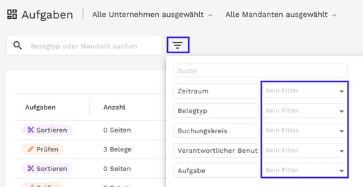 Klicken Sie neben der Suche auf das Filtersymbol und es öffnen sich die Filtermöglichkeiten durch welche Sie z.B. nach Belegtypen oder Aufgaben filtern können, die Ihnen zugewiesen wurden. Weitere Informationen finden Sie in Wie kann ich Ansichten filtern oder adaptieren?.