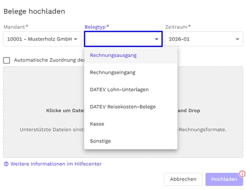 Um Belege korrekt zuzuordnen, wählen Sie beim Upload oder Scan den gewünschten Mandanten aus. Im Feld Belegtyp bestimmen Sie, in welchem Ordner der Beleg in DATEV Meine Steuern abgelegt werden soll.