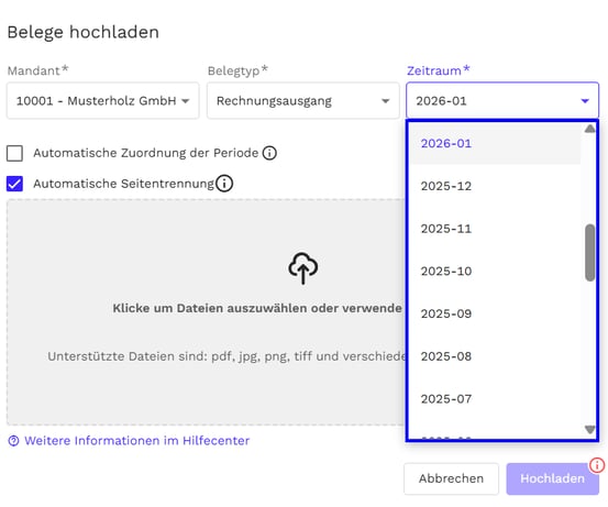 Zusätzlich definieren Sie die Periode. Sie können Belege dem aktuellen Jahr zuordnen oder bis zu einem Jahr rückwirkend hochladen. Dies stellt sicher, dass der Beleg im korrekten Veranlagungsjahr landet.