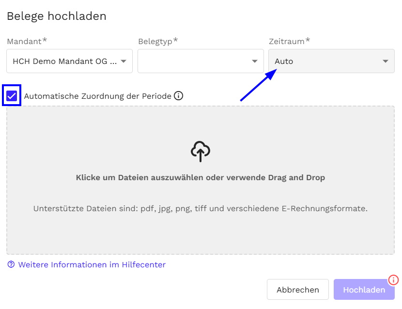 Beim Hochladen von Belegen über die Web-Oberfläche können Sie den Modus der Zuordnung steuern: